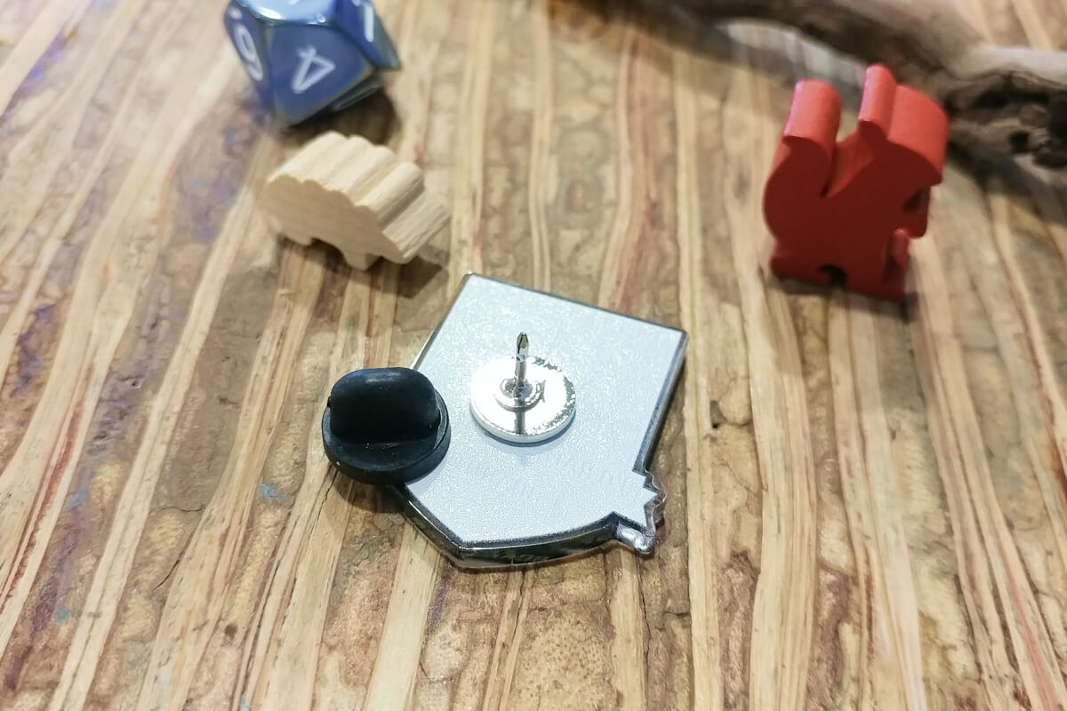 Similar to enamel pins, but made of transparent acrylic with a printed background, these pins are about 1.25” by 1.25” big with a metal pin and rubber clutch that holds the pin securely wherever you attach it.